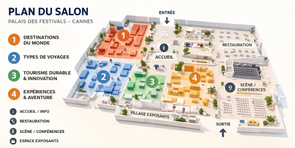 Pensé comme un véritable parcours, Horizon Travel Expo s’organise autour de quatre grands espaces thématiques complémentaires. Chaque zone propose une ambiance, des animations et des contenus spécifiques, permettant aux visiteurs de construire leur propre expérience en fonction de leurs envies.
